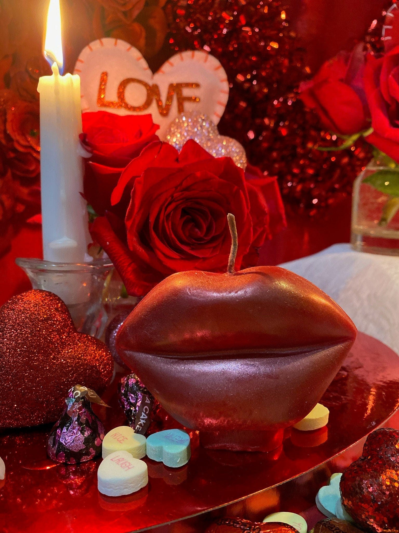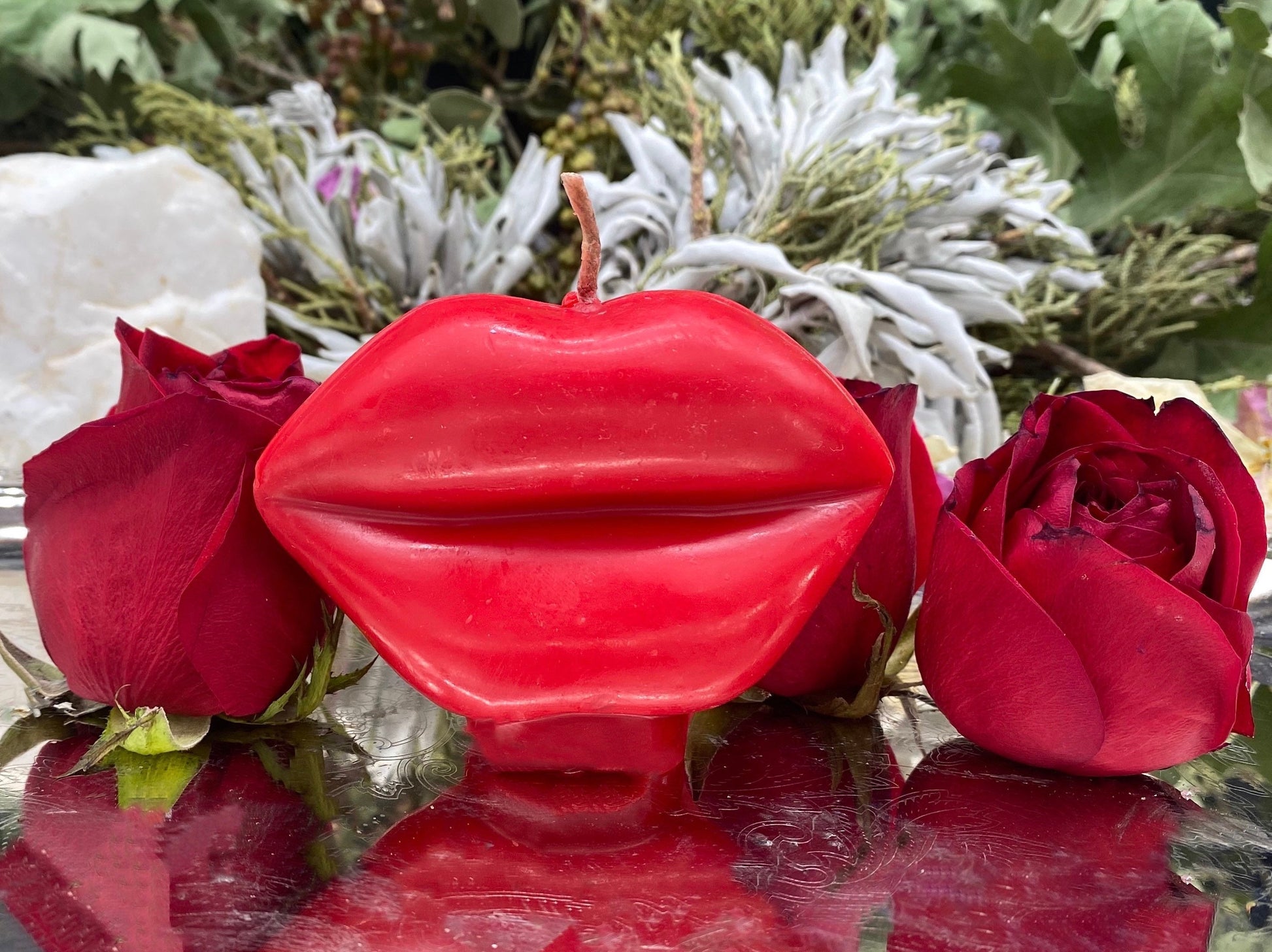 We’re offering a Lips Candle with an organic hemp wick that measures approximately 3” high and 3” wide. It is made of soy and paraffin wax.