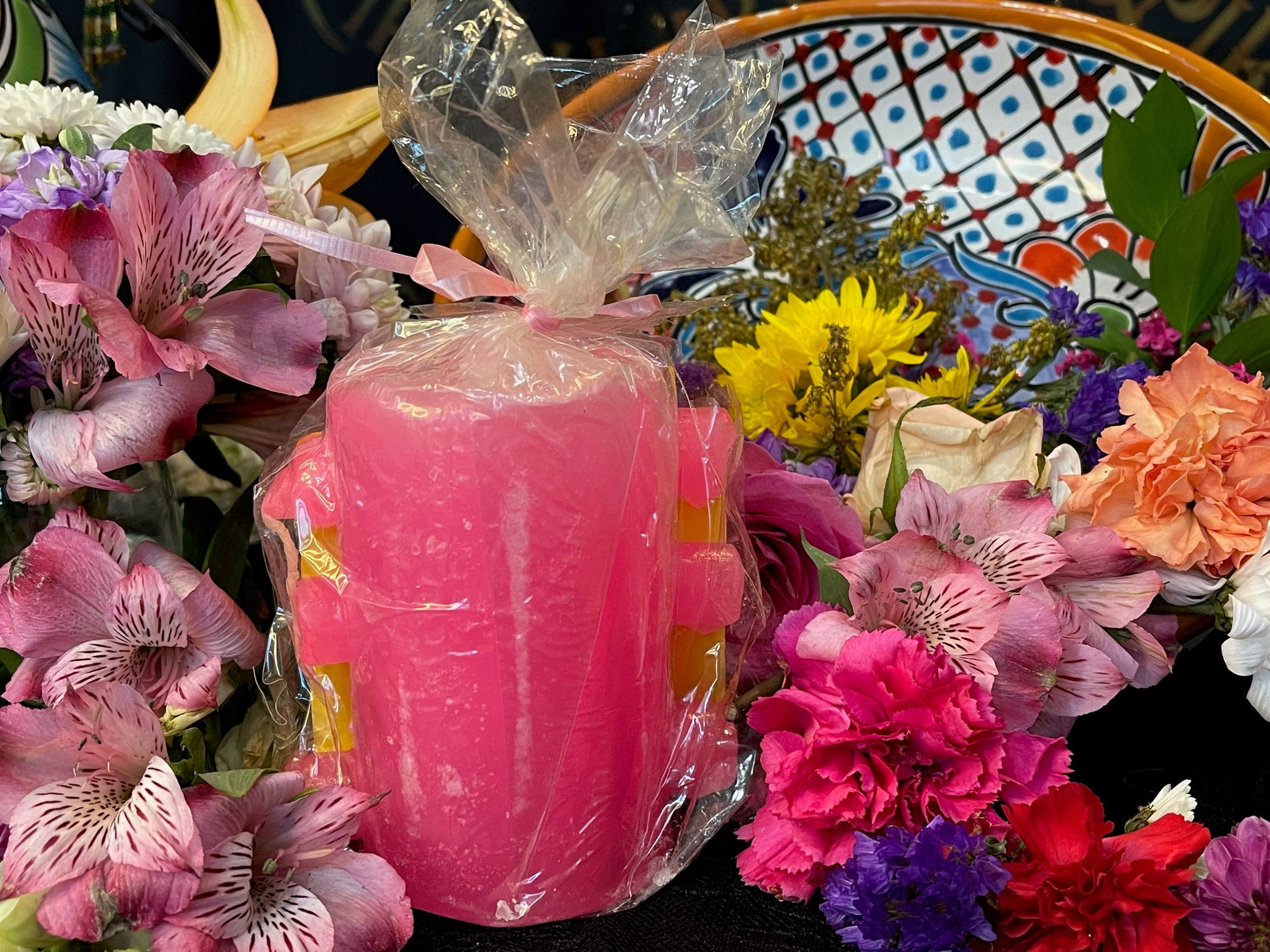 This candle is approximately 4” x 3” and made in Mexico. It’s fixed and scented.
