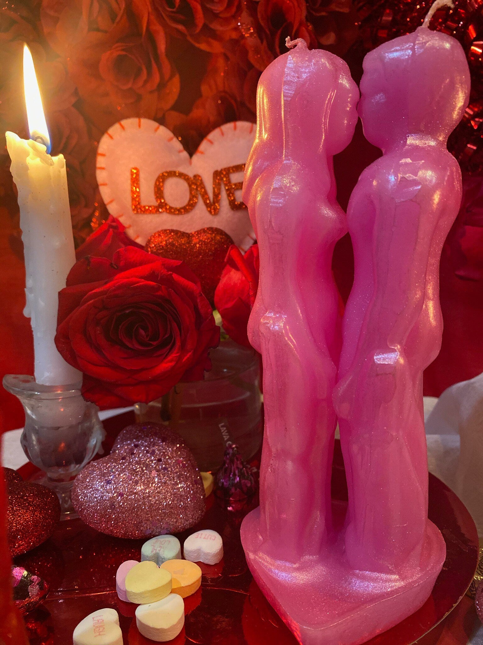We’re offering a pink, white, or red Male and Female Lovers Candle for love, passion, friendship, or marriage. It comes with a cotton wick and measures approximately 7” x 3” x 3”. It is made of paraffin wax. This candle pairs well with our Love or Marriage Oils and Herbs.