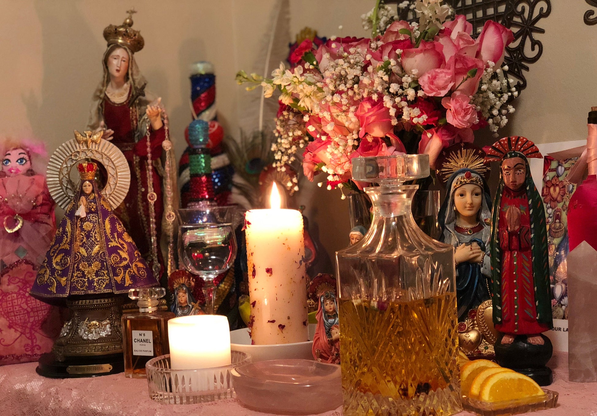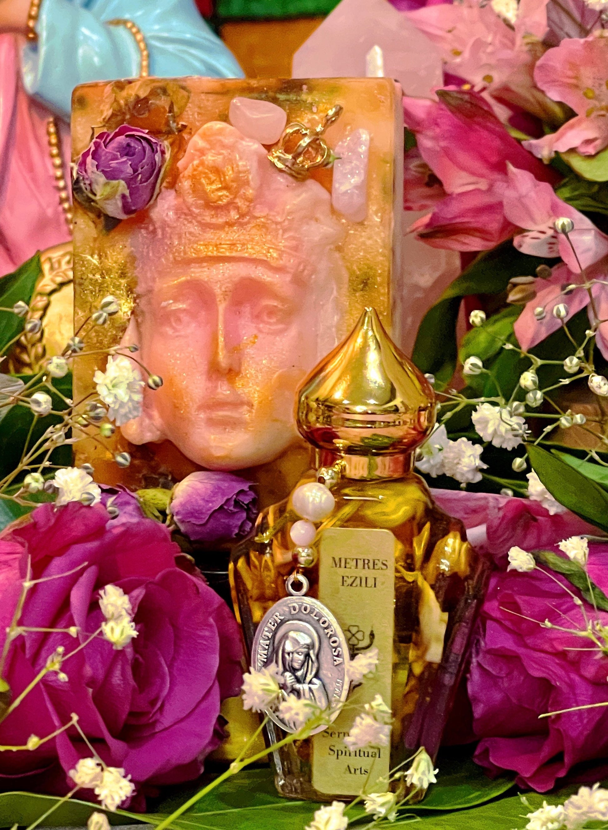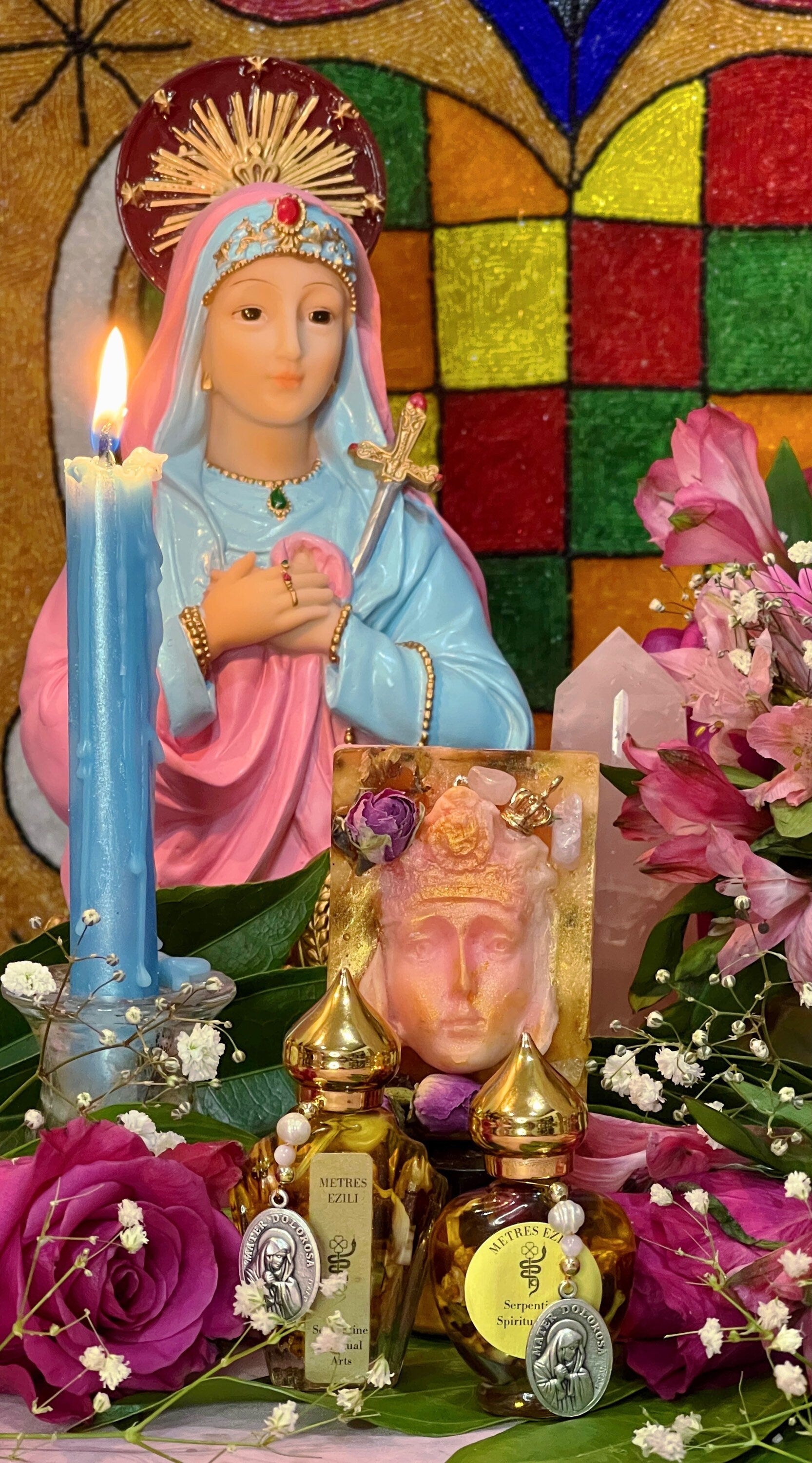 Metres Ezili is a spirit of romantic love, marriage, healing, purity, wealth, self love, writers, unconditional love, and mental health. She is the most beautiful Metresa. In Haitian Vodou, her full name is Metres Mambo Ezili Freda Daome. She is syncretized with Mater Dolorosa. She is also called Metresili in Sanse (Puerto Rican Vodou) and 21 Divisions. Some consider her the patroness lwa of gay men. Metres Ezili is a spirit to approach for assistance with luxury, beauty, love, abundance, prosperity, clairvoyance, and writing. It is best to serve her on Thursday (her sacred day) and on her feast day of September 15th. She enjoys luxurious offerings of pink roses, perfumes, chocolates, jewelry, soaps, mirrors, and hand towels. She is partial to Chanel No. 5, gold rings, Lotion Pompeia, and the colors light pink, white, and light blue. She also accepts offerings of orange juice, milk, pink champagne, grenadine, basil, and fruit.