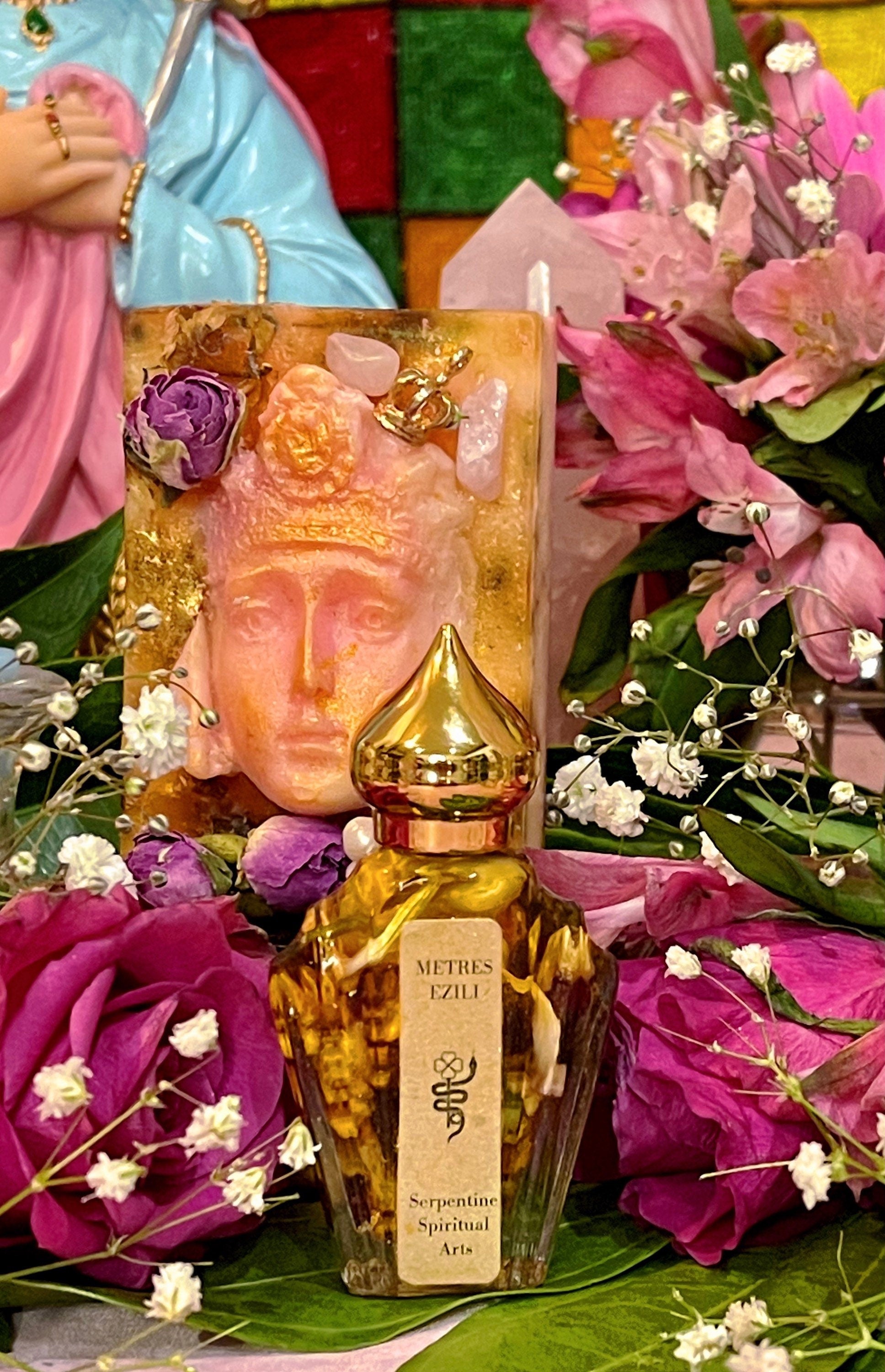 This oil is handcrafted by Sancista Jennifer with the highest quality traditional ingredients available. It was created on Metres Ezili's feast day, prayed over for 9 hours, and charged on her altar. Sancista Jennifer decorated the bottles with various gemstones, pearls, and Czech glass beads.