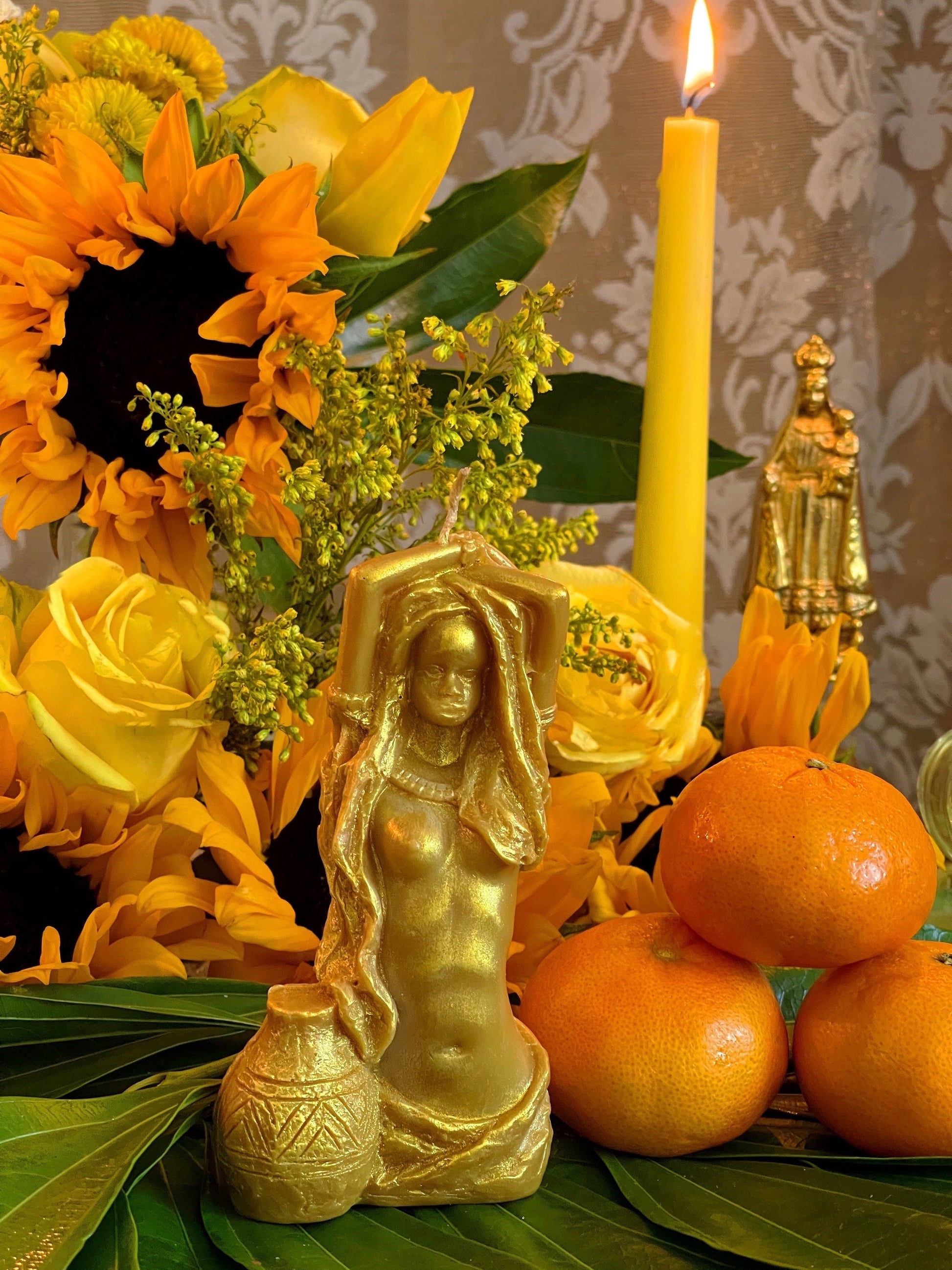 We’re offering an Oshun Ritual Set.  It includes an Oshun Oil, Bath Soak, Herb Bath, Candle, Incense, and Herbs. It is blessed and lovingly prepared.