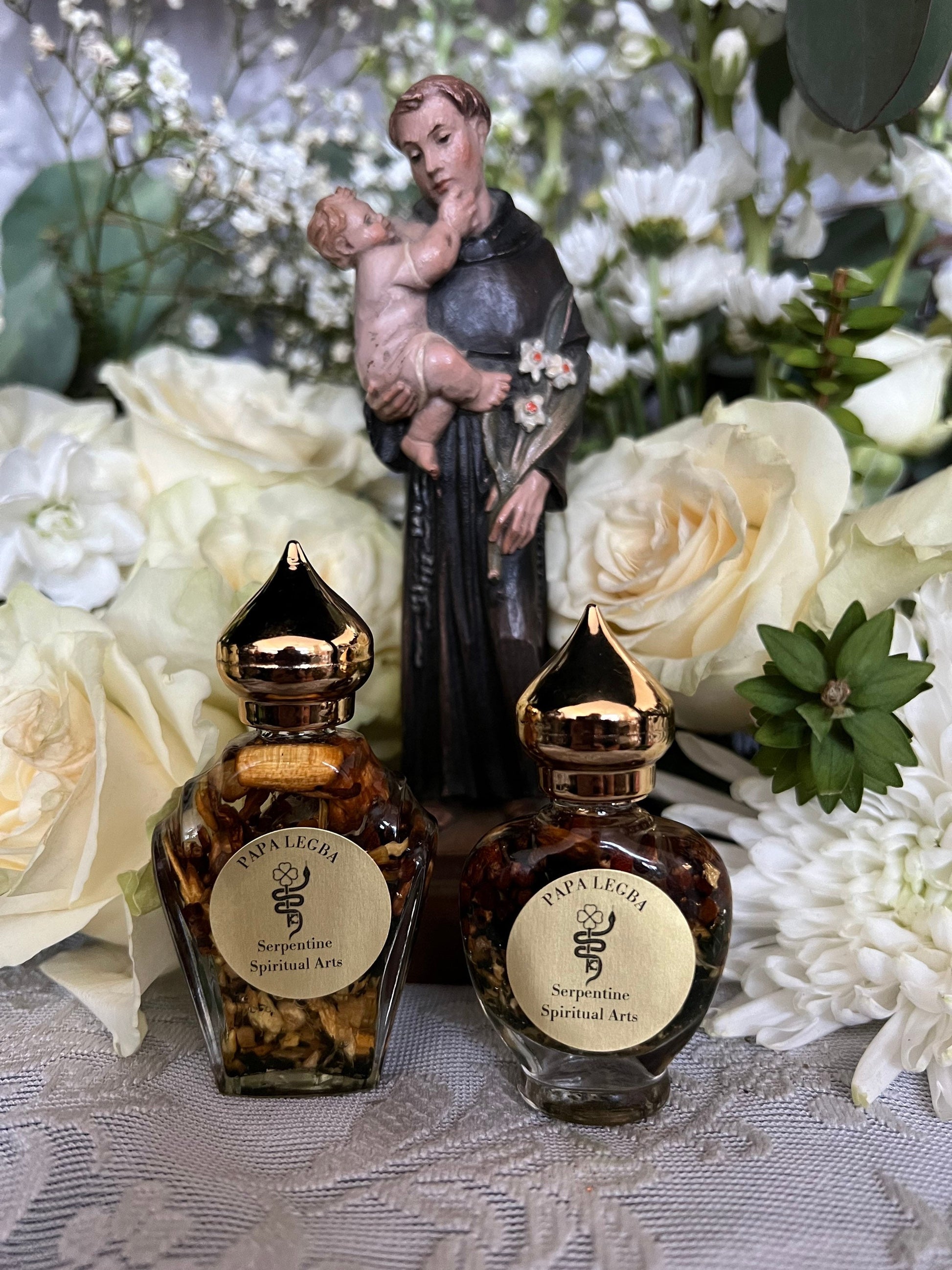 Papa Legba is the Lwa who rules the crossroads and is gatekeeper to the Lwa. He controls the entrance and departure of the Lwa into and out of the peristyle. Papa Legba assists with opening roads, removing obstacles, gaining employment, locating lost objects, and bringing blessings, prosperity, and luck. He is saluted as the keeper of the gate and master of all crossroads, which is where the spirit and human realm intersect. He is also known for closing roads when he feels neglected or angry. He is the divine trickster and represents transformation. Papa Legba is synced with Saint Anthony of Padua in Sanse (Puerto Rican Vodou) and Saint Lazarus in Haitian Vodou. Saint Lazarus is synched with Papa Legba Viejo in Sanse and can also be on a Papa Legba altar along with Elegua. We also serve certain Orisha in Sanse. This oil is handcrafted by Sancista Jennifer with the highest quality traditional and divined ingredients available. She created it on Saint Anthony’s feast day in June 13th, prayed over it for 9 days, and charged it on her altar. She decorated the bottles with various gemstones, pearls, and Czech glass beads. The medal attached to the large bottle was blessed by the Pope at the Vatican in Italy. There are over 10 ingredients in this oil. Some of them include abre camino, red palm oil, and palo santo. It comes in a luxurious 1/3 or 1/2 oz bottle.