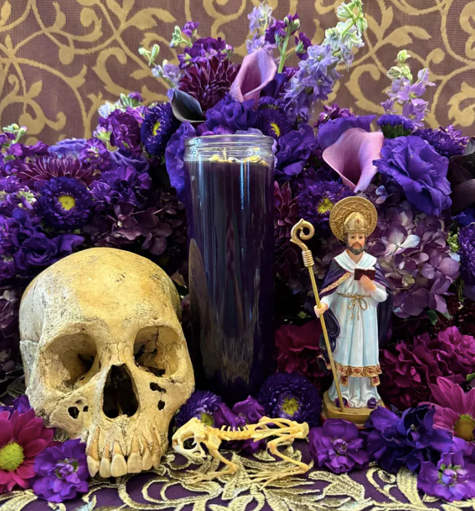 We use our Saint Cyprian oil for our candles and workings, which we birthed and prayed over for 27 days, during the days of the Cyprians and on his feast day of September 26th. Some of our rare ingredients include oudh, black diamond, bone from three human skulls, black-spined toad, black frankincense, black cat hair ritually collected according to the book of Saint Cyprian, black styrax, amansa guapo, palo San Cipriano, black snake skin, graveyard crossroads dirt, and so much more. There are over 75 ingredients in the oil. We spared no expense sourcing the most potent ingredients from all over the world.