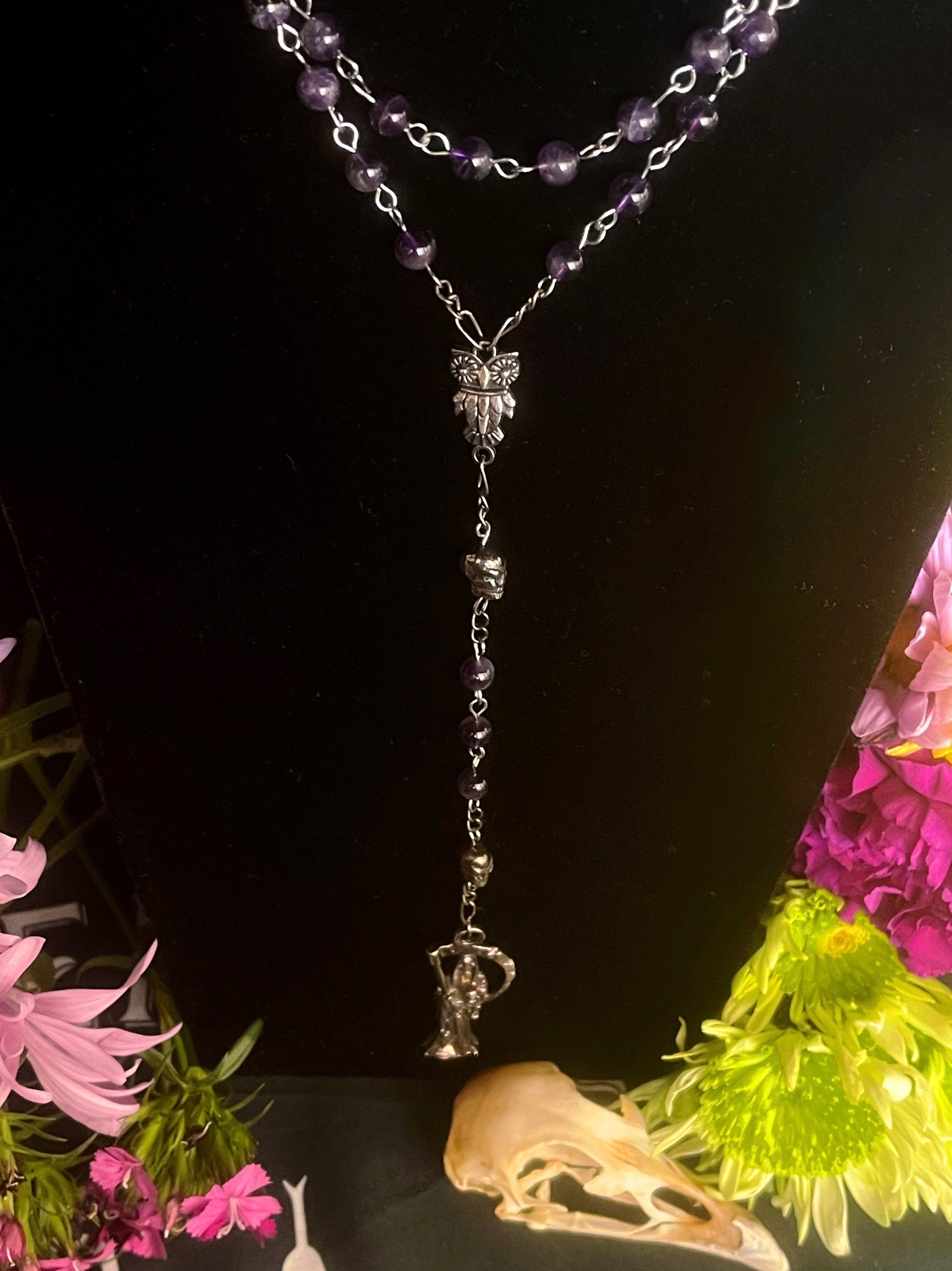 Santa Muerte Morada Rosary + Blessed + Purple + Amethyst + Handcrafted + Sterling Silver Chain + Rosario