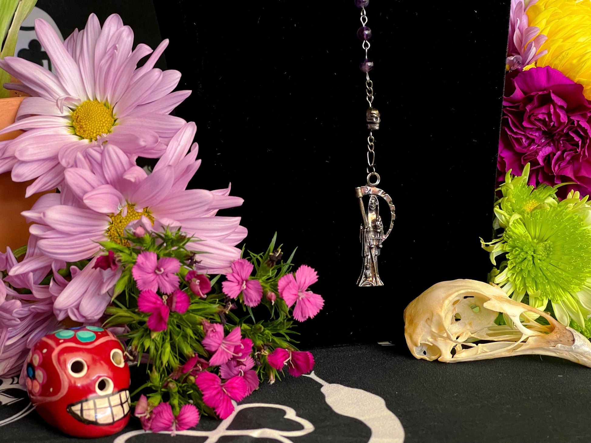 La Santa Muerte is a Mexican folk Catholic saint of death who is known by many names such as Santisima Muerte, La Flaca, La Niña, and La Madrina. La Santa Muerte is the embodiment of death with the highest power over life of any spirit or saint--second only to God. Many venerate her as she accepts people from all walks of life and does not discriminate against LGBTQ+, sex workers, criminals, and gang members. She is often depicted as a grim reaper-like skeleton holding a scythe, scales, or a globe. When one is interested in spirituality, health, psychic abilities, or dreams, the purple robe is an excellent choice to work with. This rosary was handcrafted by a Muertera using amethyst beads and a La Santa Muerte pendant. We cleansed each of them with a ritual and charged them on La Santa Muerte's altar.