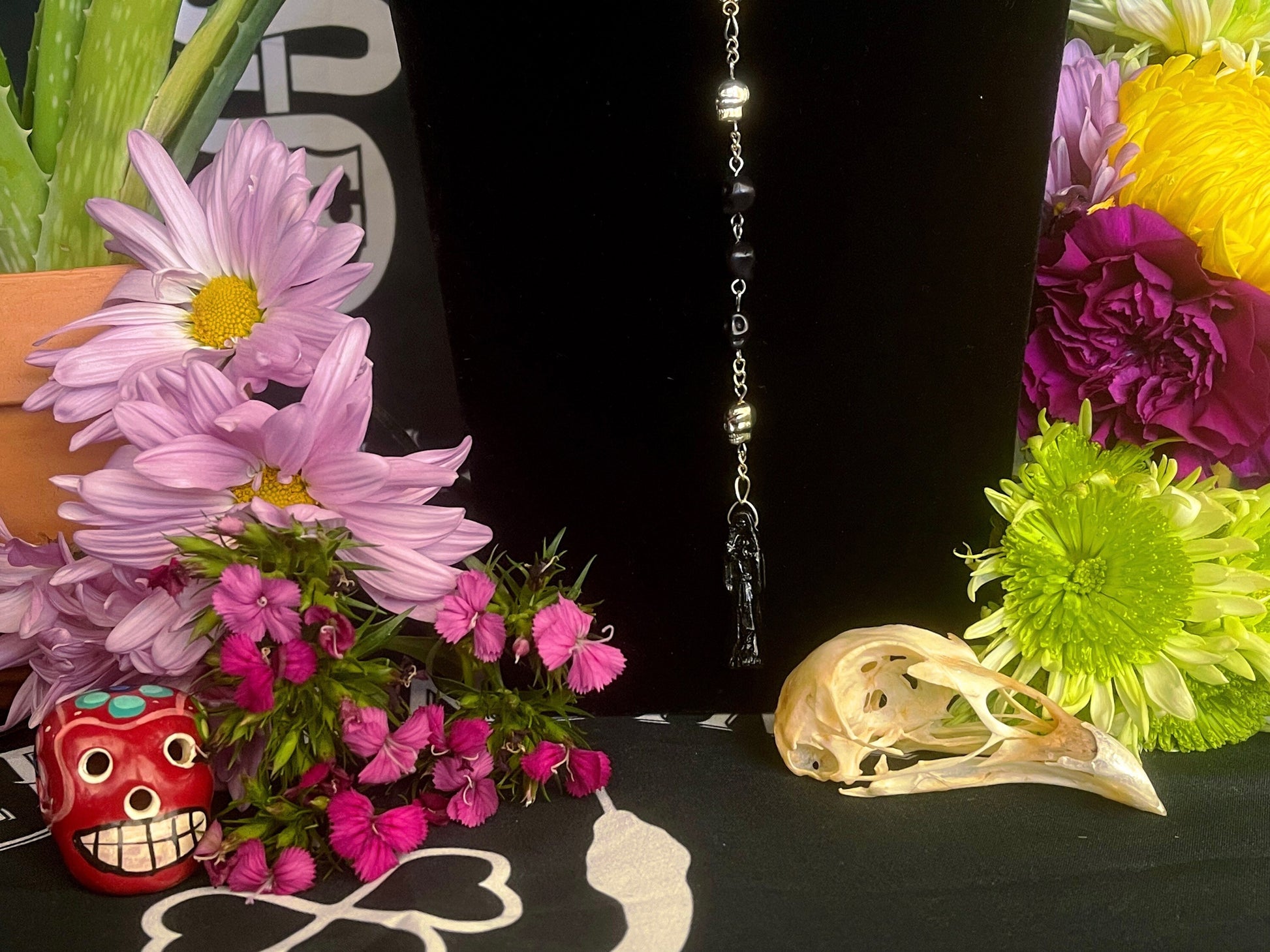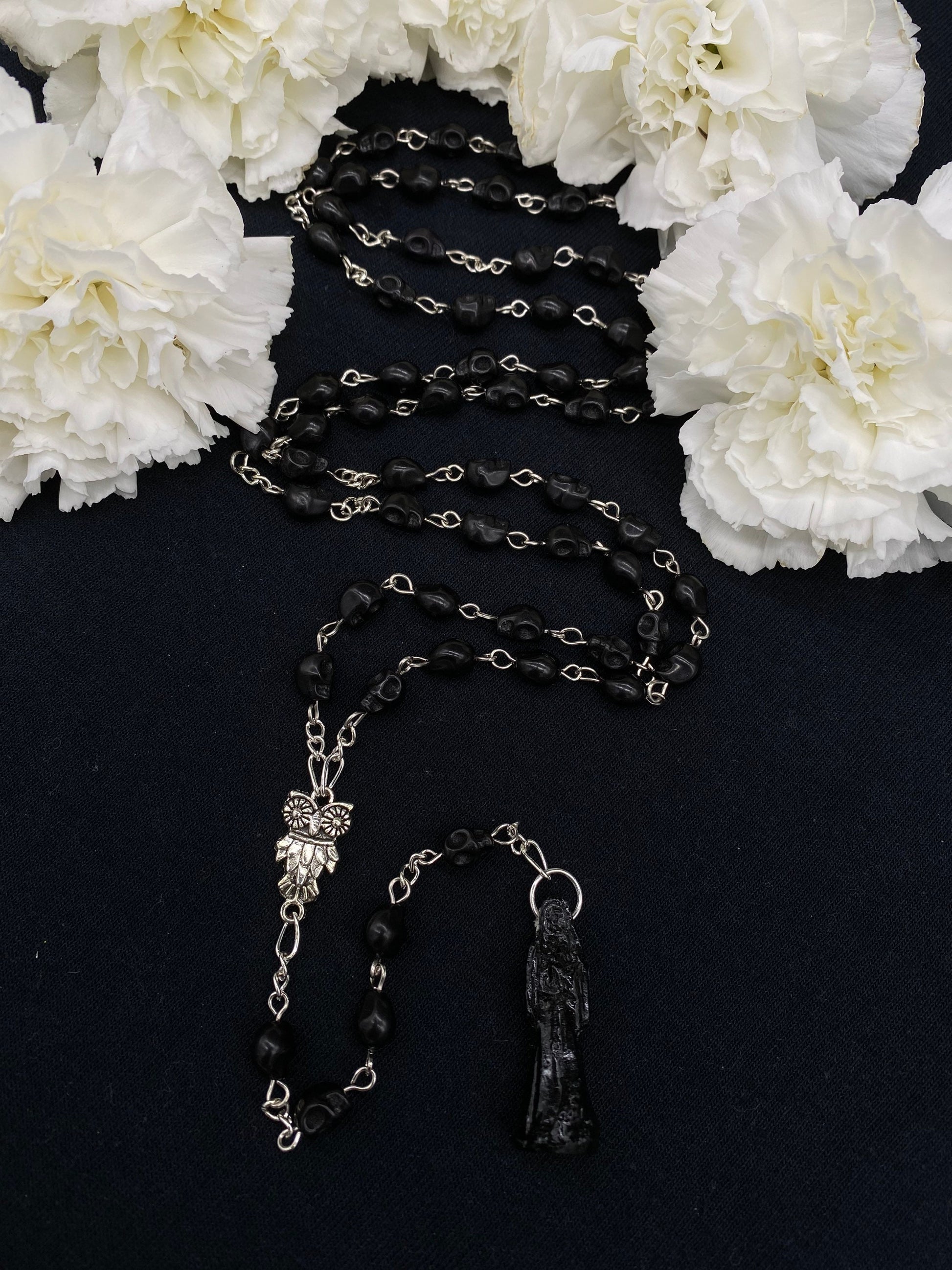 Santa Muerte Negra Rosary + Blessed + Sterling Silver Plated Chain + Handcrafted + Rosario