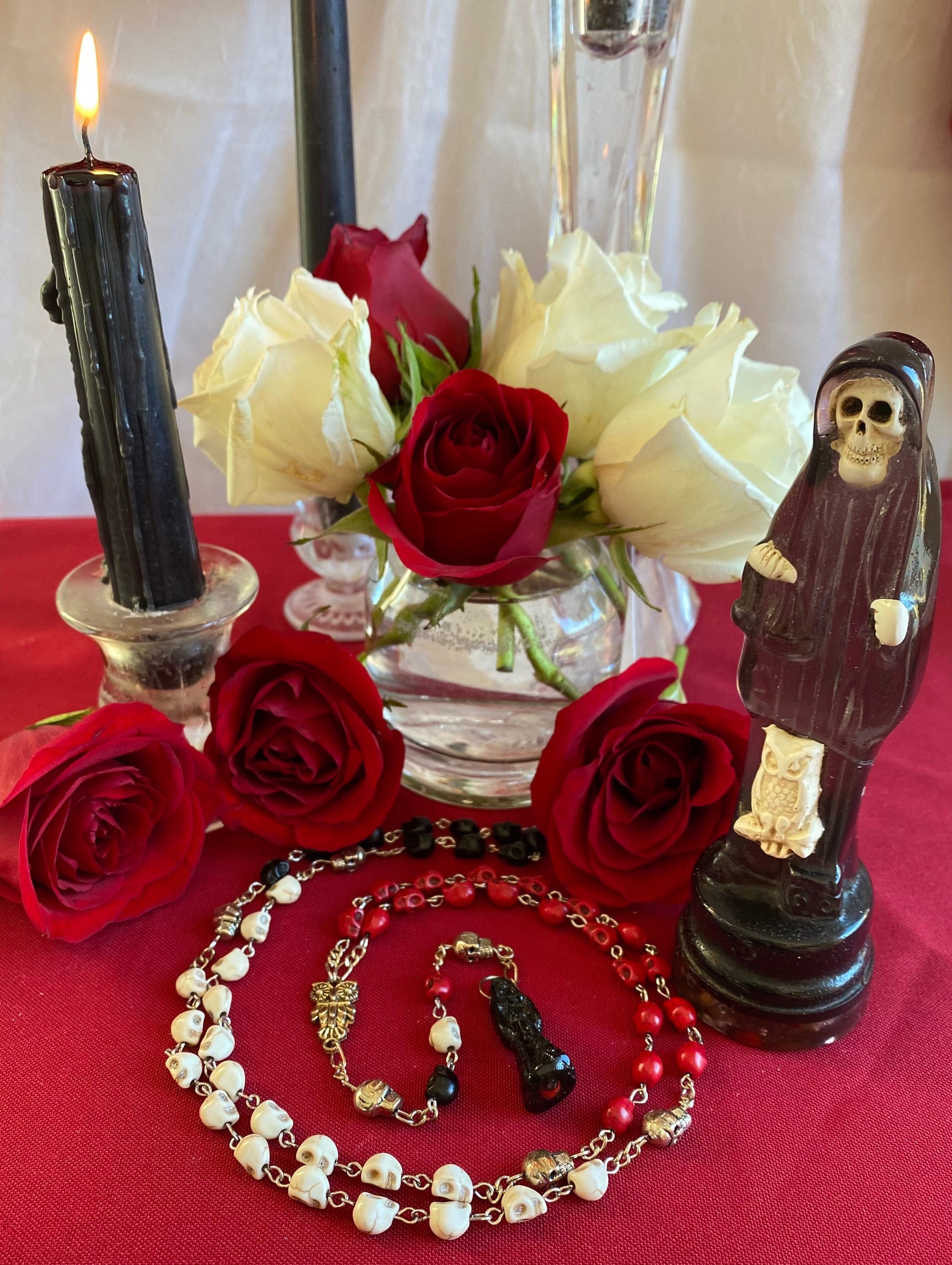 La Santa Muerte is a Mexican folk Catholic saint of death who is known by many names such as Santisima Muerte, La Flaca, La Niña, and La Madrina. La Santa Muerte is the embodiment of death with the highest power over life of any spirit or saint--second only to God. Many venerate her as she accepts people from all walks of life and does not discriminate against LGBTQ+, sex workers, criminals, and gang members. She is often depicted as a grim reaper-like skeleton holding a scythe, scales, or a globe. La Santa Muerte has three traditional robes or personalities: white (La Blanca), red (La Roja), and black (La Negra). Each robe represents a different side of her. La Blanca is the most approachable robe and is the aspect of purity, healing, guidance, peace, balancing emotions, and cleansing. La Roja represents love, money, prosperity, passion, justice, legal issues, fidelity, and marriage. La Negra is the fiercest of the robes and is feared by other malevolent spirits. She is associated with protection, reversing, revenge, and cursing.
