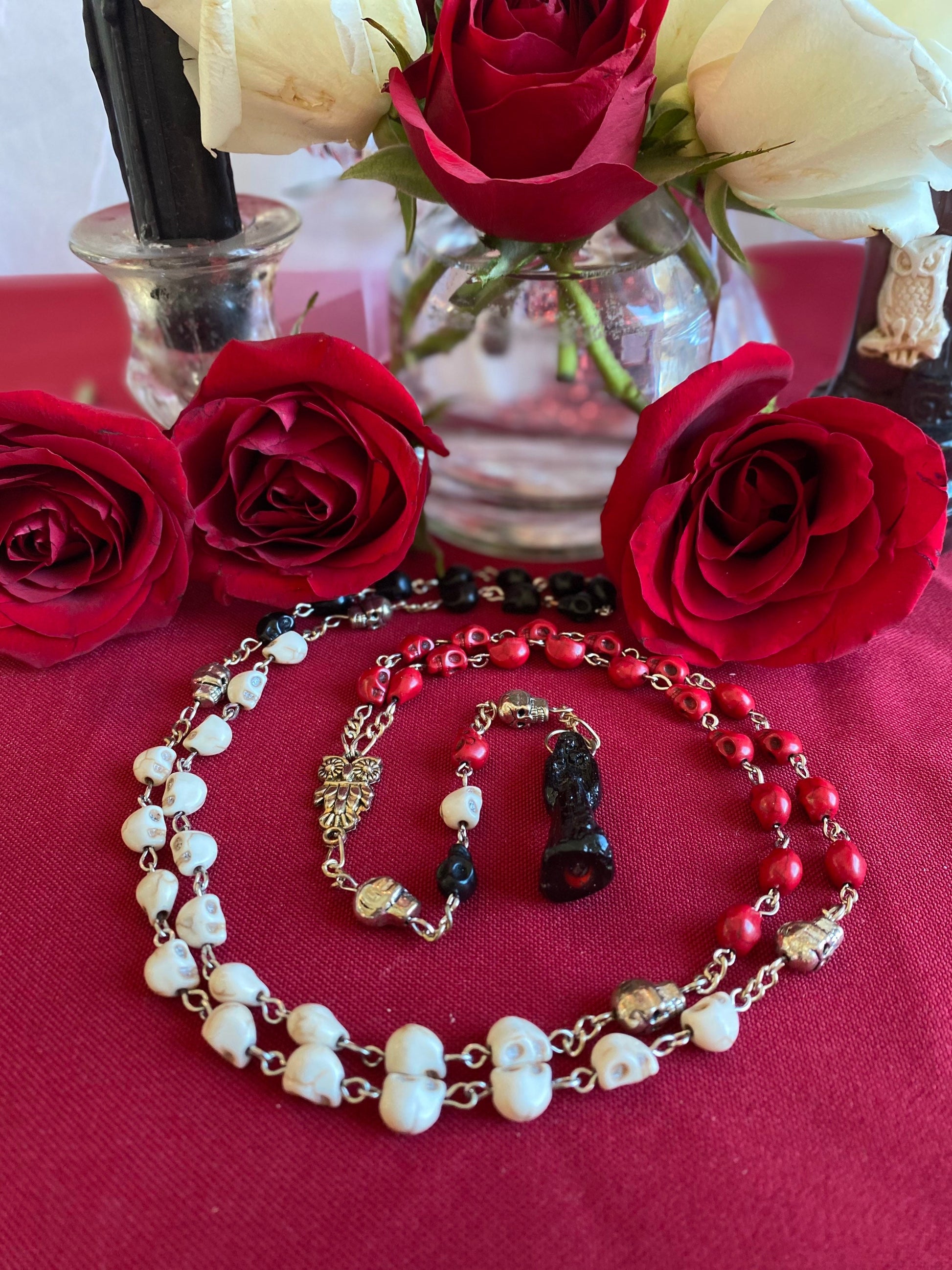 This rosary was handmade by a Muertera using howlite skulls, sterling silver plated wire, and a fixed La Santa Muerte Statue. We cleansed each of them with a ritual and charged them on La Santa Muerte's altar.