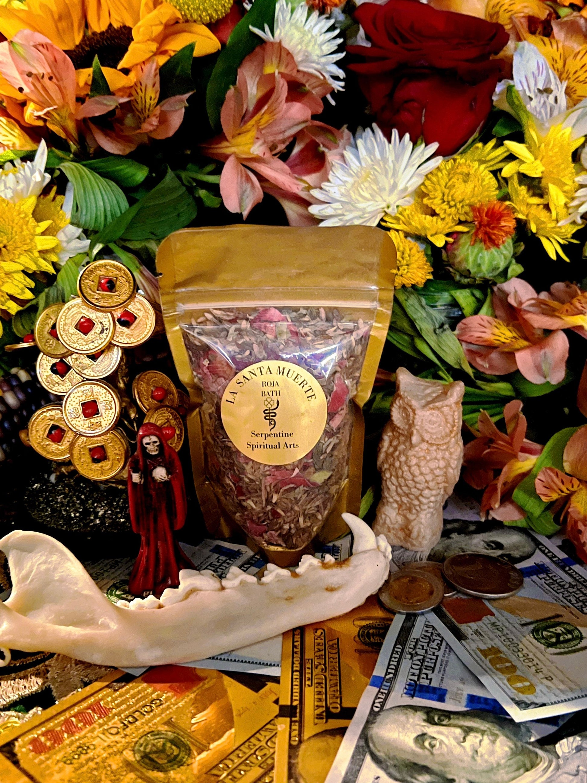 The bag weighs approximately 1 or 3 oz and contains mostly organic ingredients and herbs imported from Mexico that are often associated with La Santa Muerte Roja.