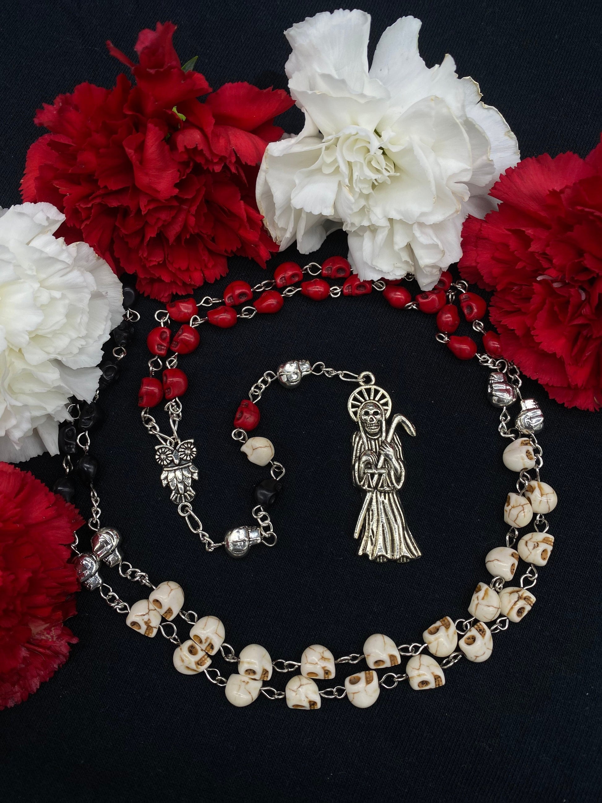 Santa Muerte Rosary + Traditional Colors + Blessed + Sterling Silver Plated Chain + Handcrafted + Rosario