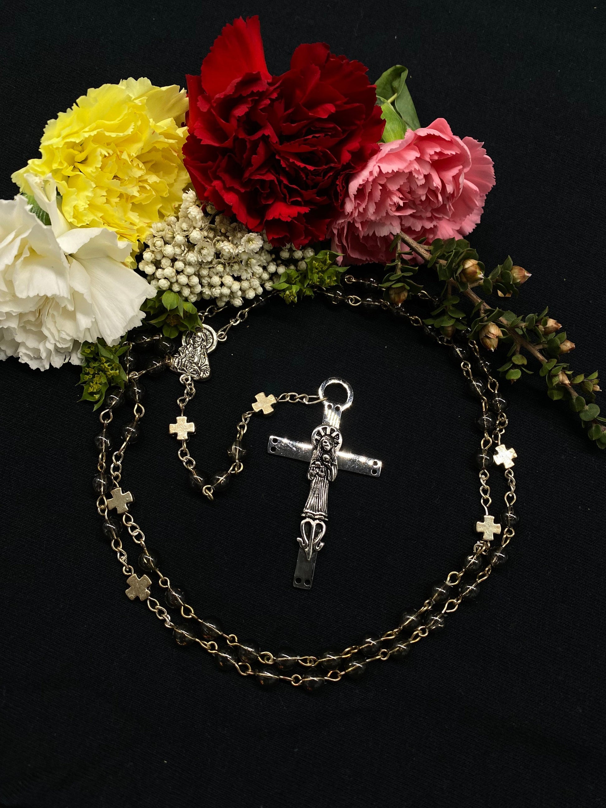 Santa Muerte Rosary with Smoky Beads & Santa Muerte Cross + Sterling Silver Plated Chain + Handcrafted + Rosario