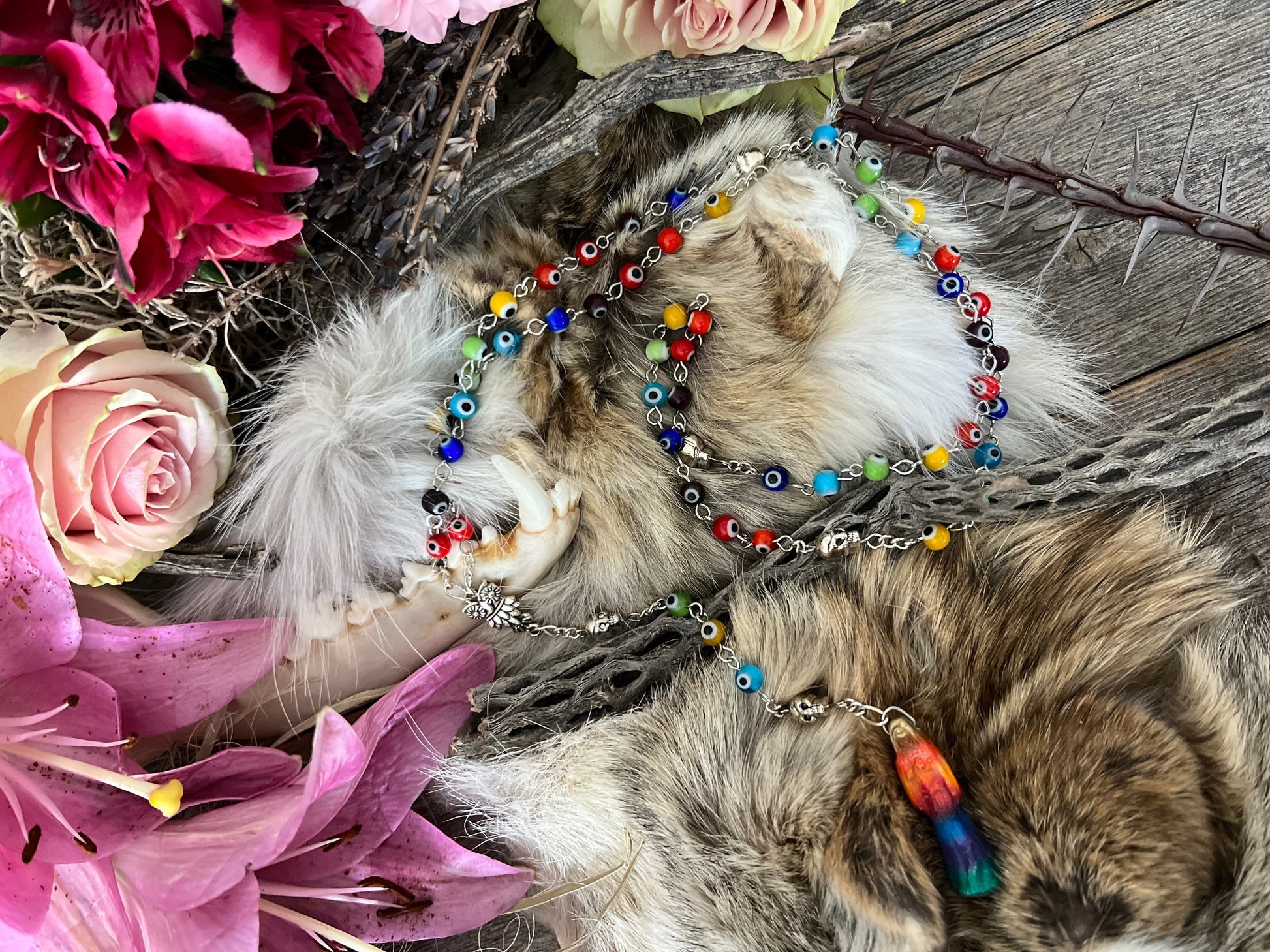 Santa Muerte Siete Colores Evil Eye Rosary + Blessed + Sterling Silver Plated Chain + Handcrafted + Rosario