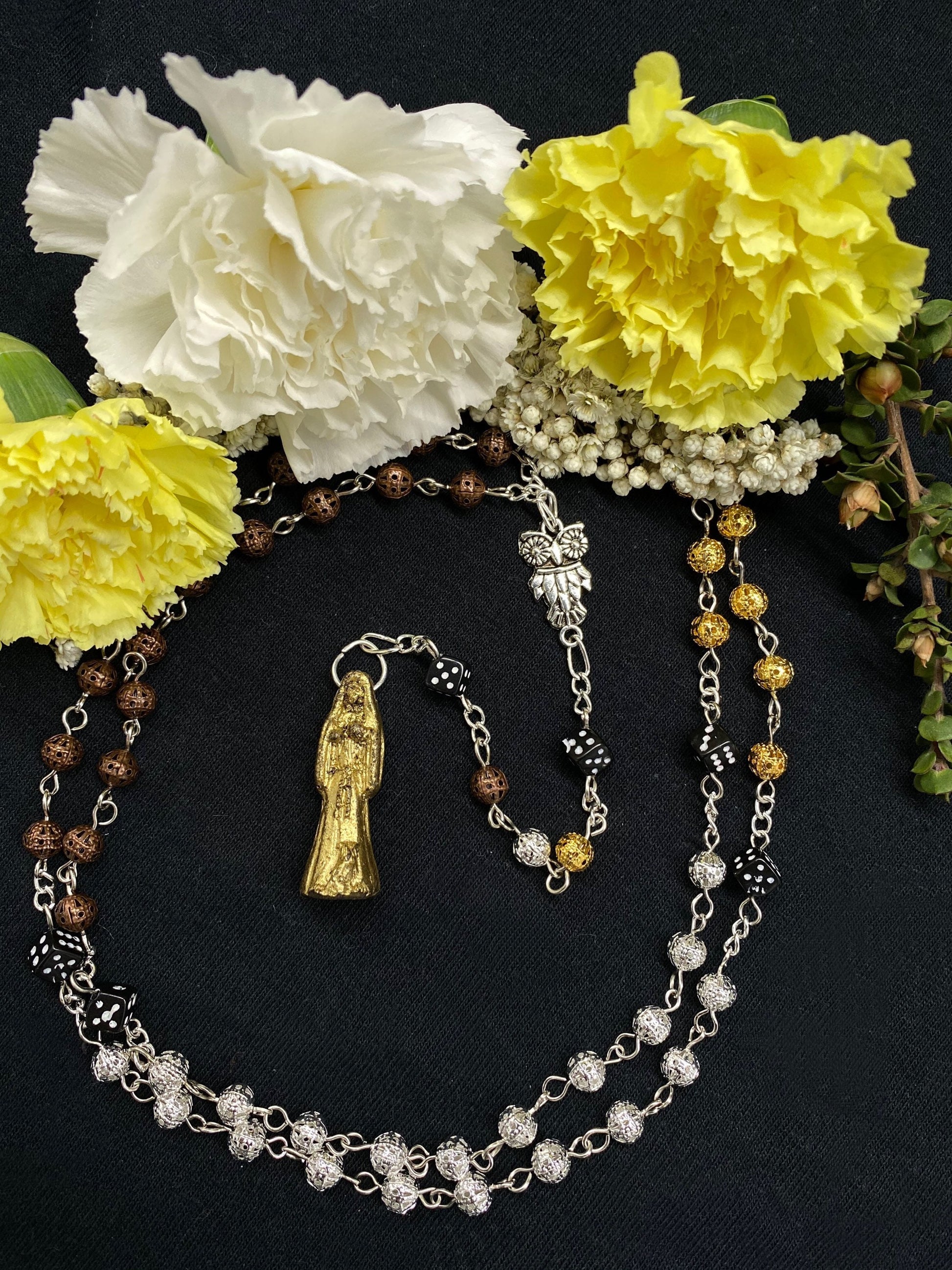 This rosary was handcrafted by a Muertera using gold, silver, and copper metal beads, black dice, and a fixed La Santa Muerte Statue. We cleansed each of them with a ritual and charged them on La Santa Muerte's altar.