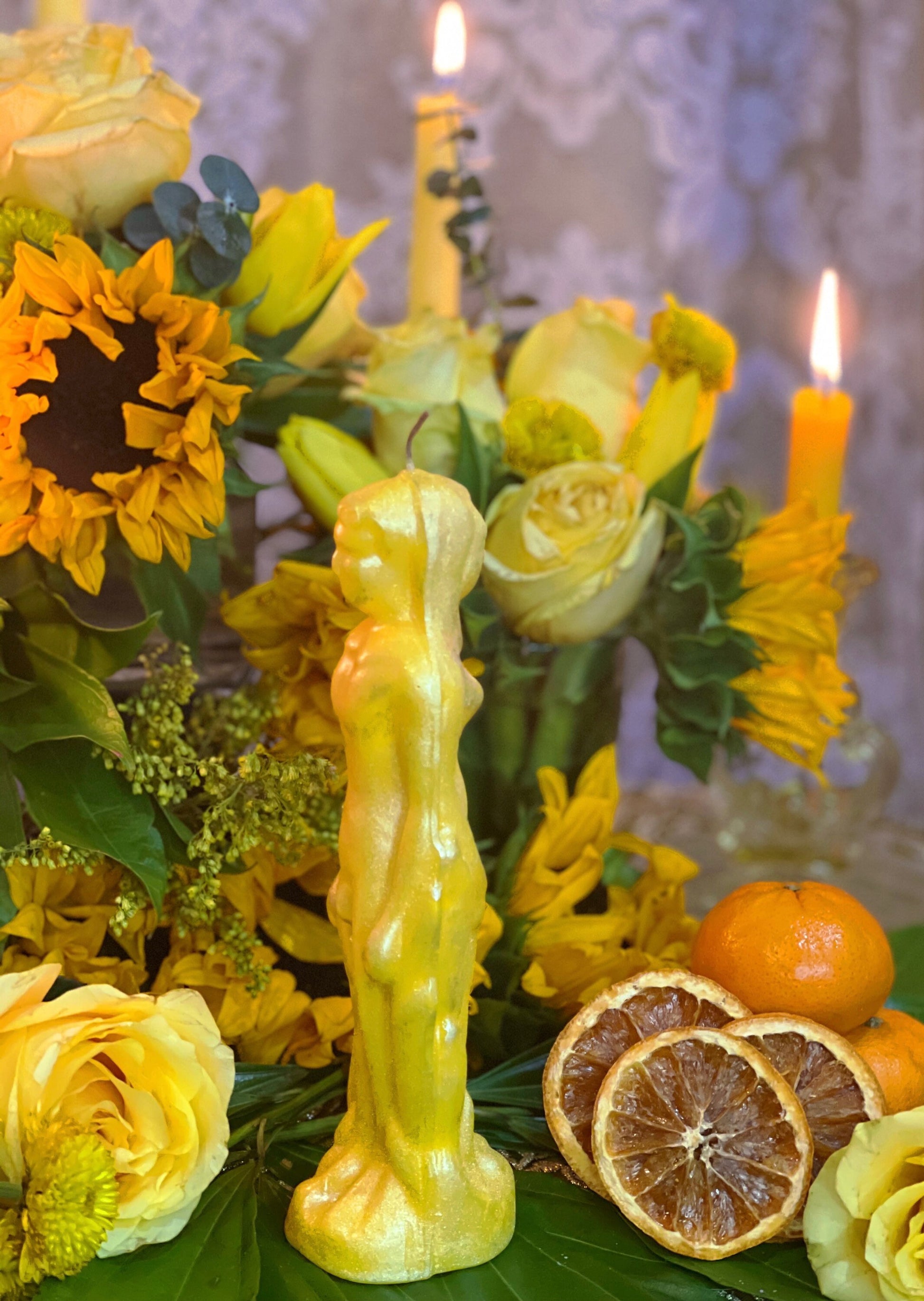 We’re offering a Dual Gender Male & Female Figure Candle with an organic hemp wick. The figure candle measures approximately 8” x 2”. It is made of soy and paraffin wax. This candle is sometimes useful for transgender, dual gender, multi-gendered, or two-spirit (for Native Americans) folx. This often pairs well with our Love Oil and Candle Dressing Herbs, which are not included.